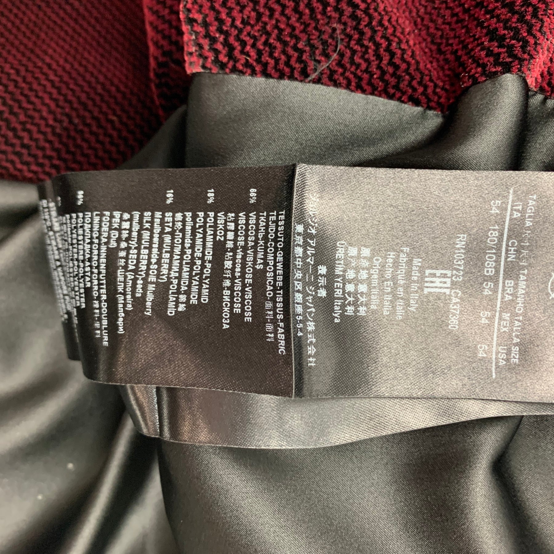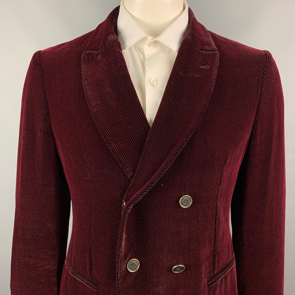 GIORGIO ARMANI "Ginza" sport coat comes in a burgundy & black viscose / nylon with a full liner featuring a peak lapel, slit pockets, and a double breasted closure. Made in Italy.