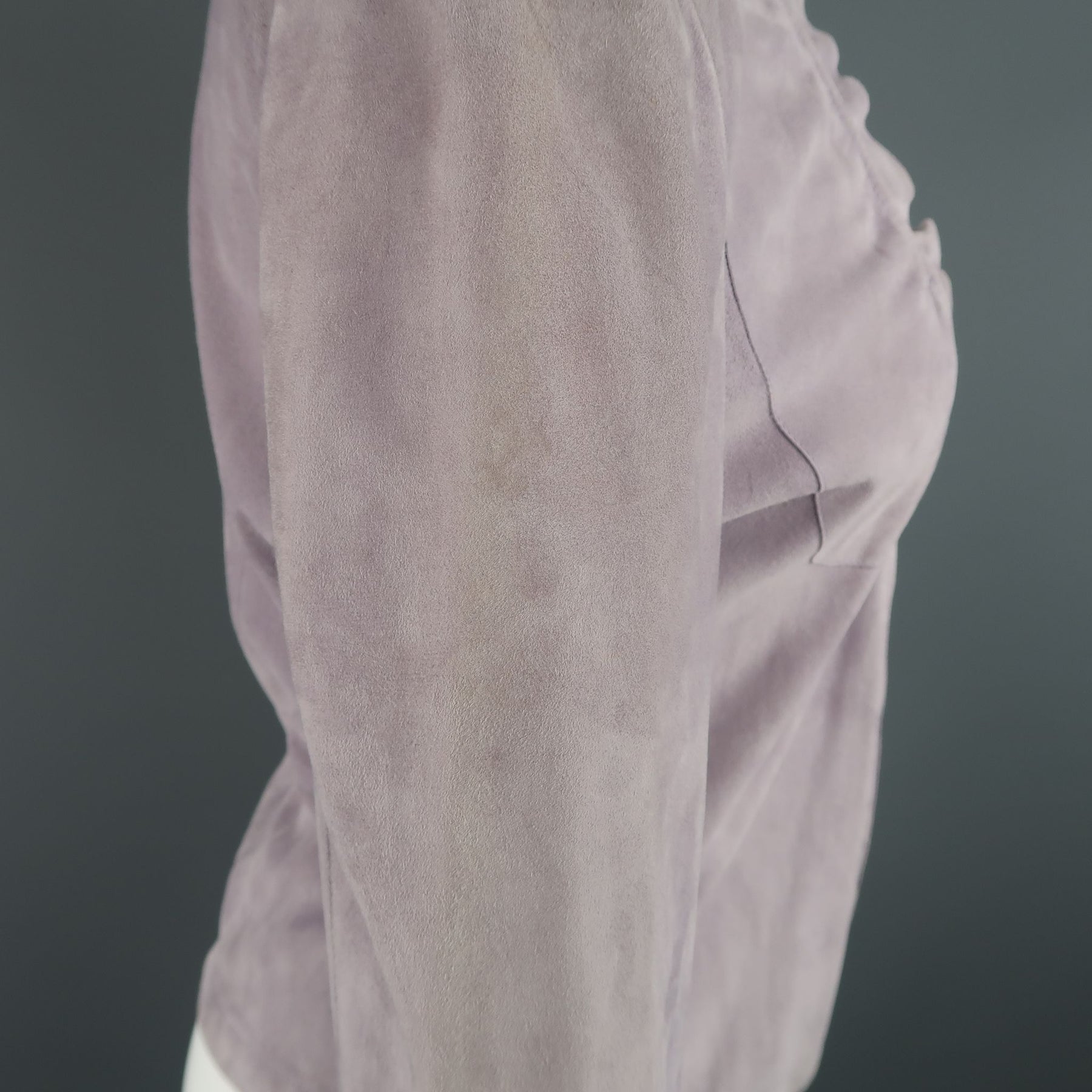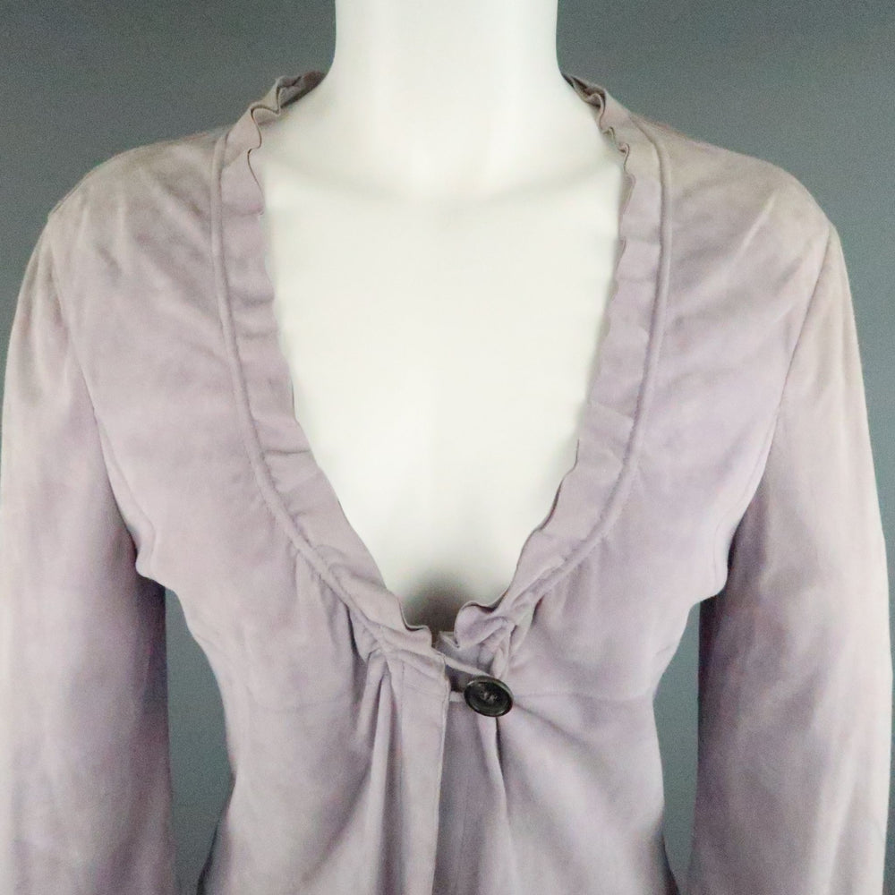 GIORGIO ARMANI cardigan jacket comes in a light weight lavender nubuck suede leather and features a single button closure, empire waist with underbust seam, and ruffled trim. Discoloration throughout suede. As-Is. Made In Italy.