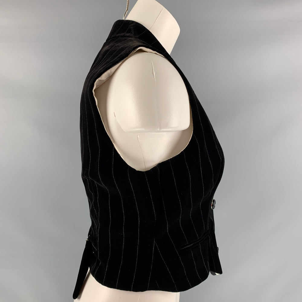 GIORGIO ARMANI vest comes in a black viscose and silk striped velour fabric with silk lined featuring double breast, slit pockets, and a buttoned closure. Made in Italy.