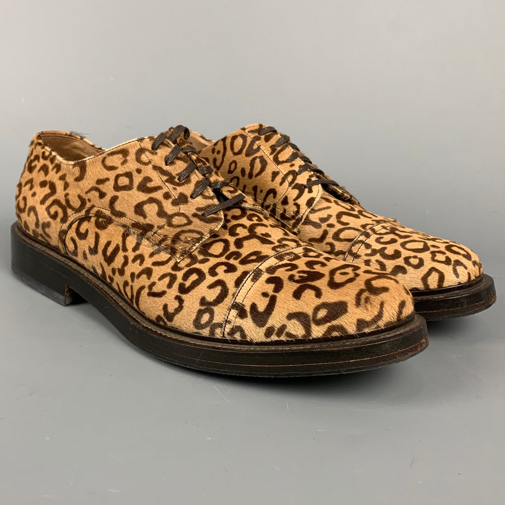 GIORGIO ARMANI shoes comes in a tan & brown animal print leather featuring a cap toe, wooden sole, and a lace up closure. Made in Italy.