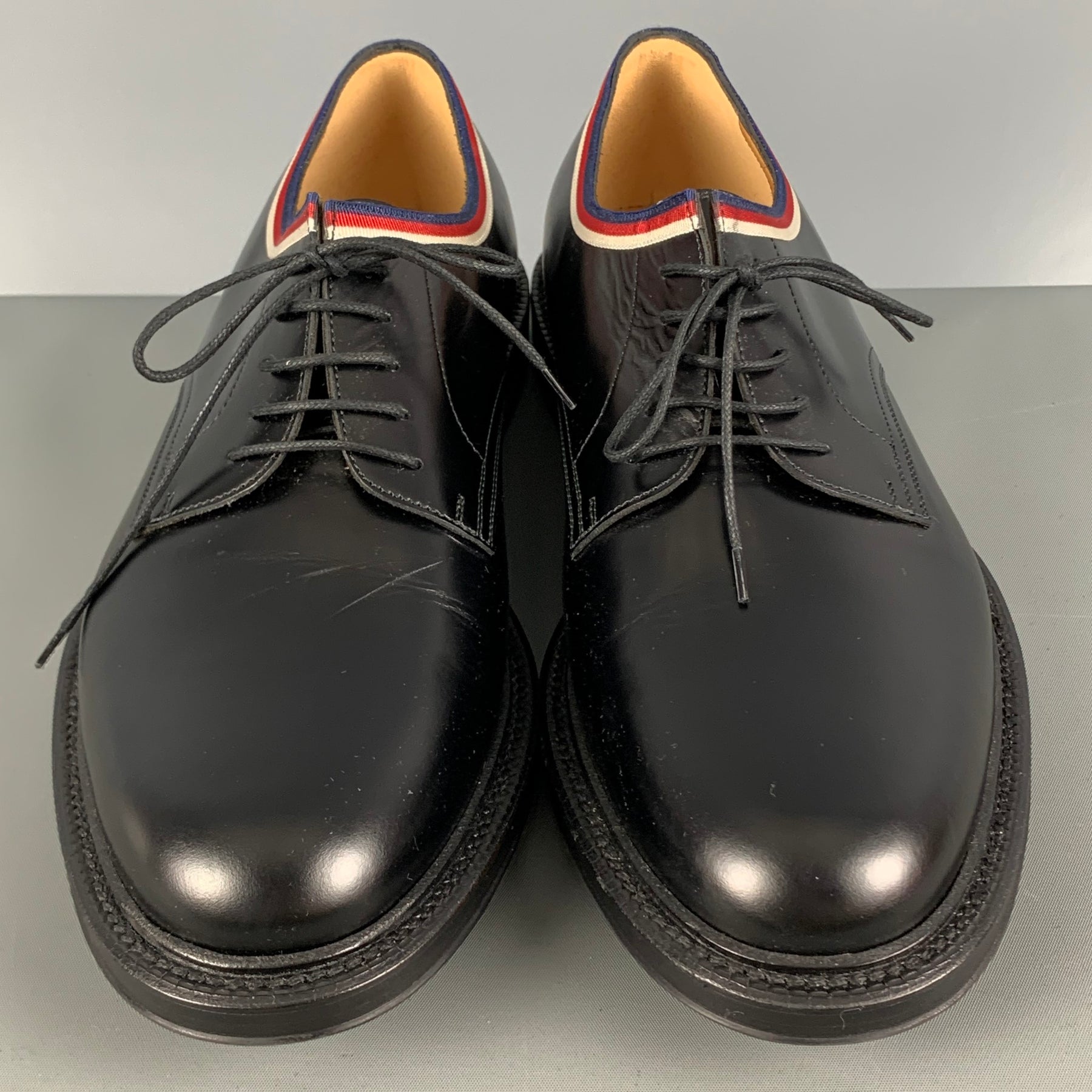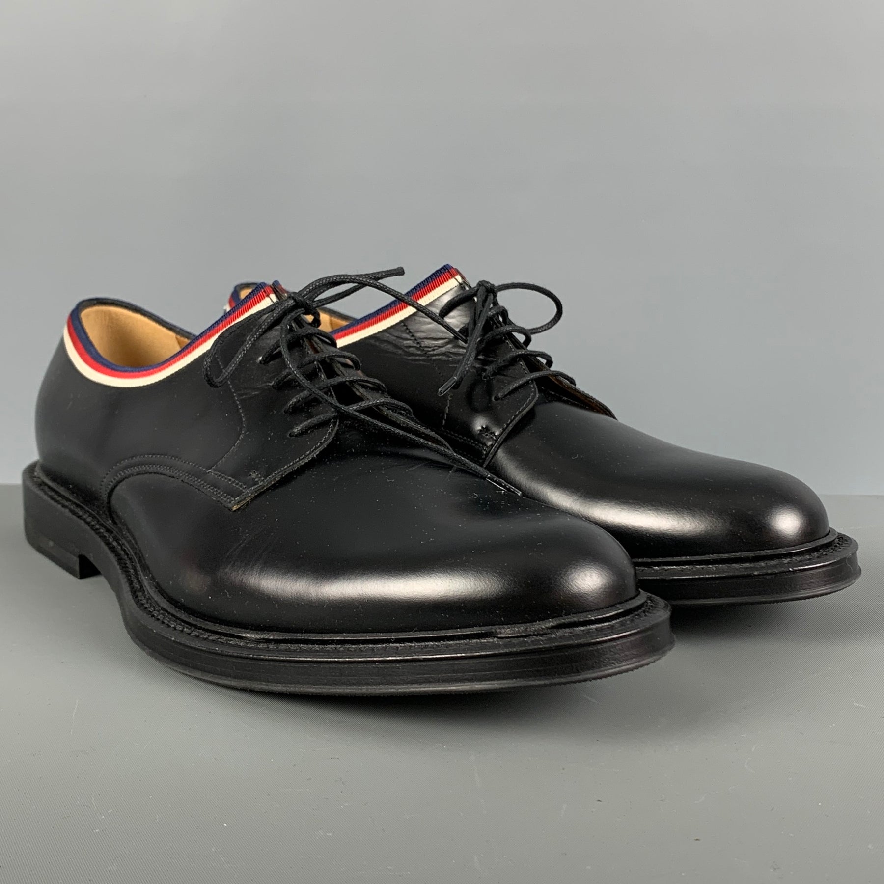 GUCCI shoes comes in a black leather featuring a derby style, blue, red and white ribbon detail, and a lace up closure. Made in Italy.