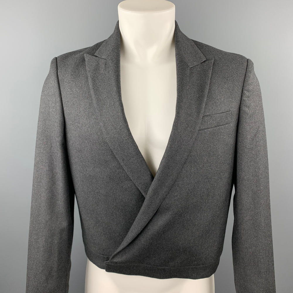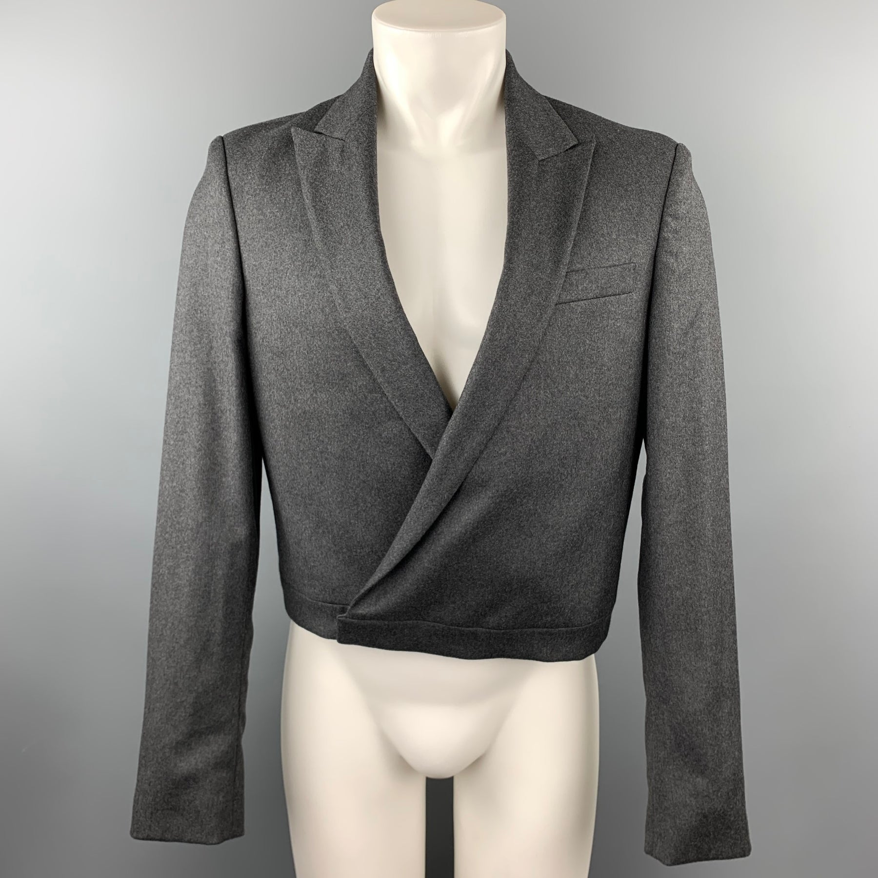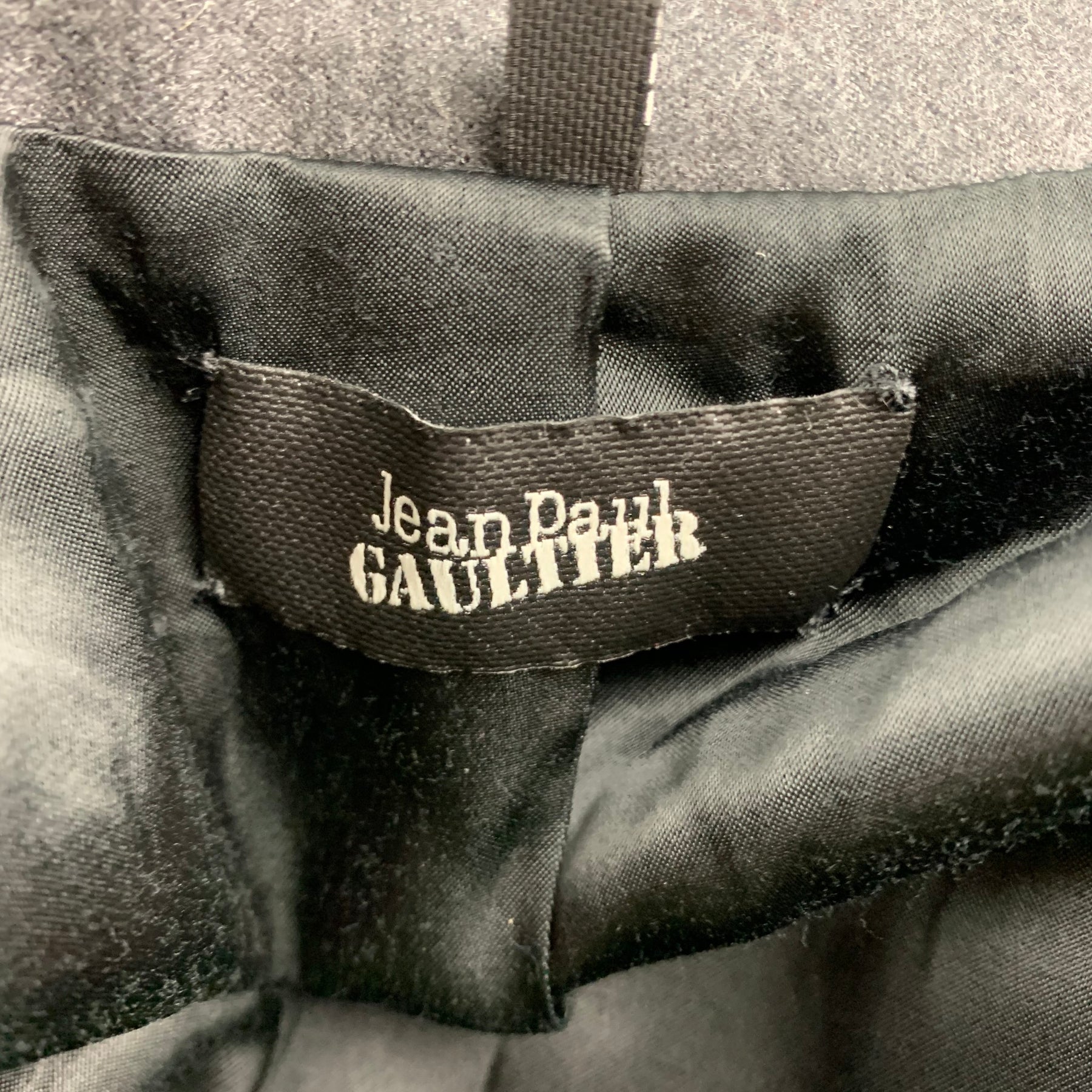 JEAN PAUL GAULTIER jacket comes in a dark gray wool / cashmere featuring a cropped style, peak lapel, and a hook & eye closure. Made in Italy.