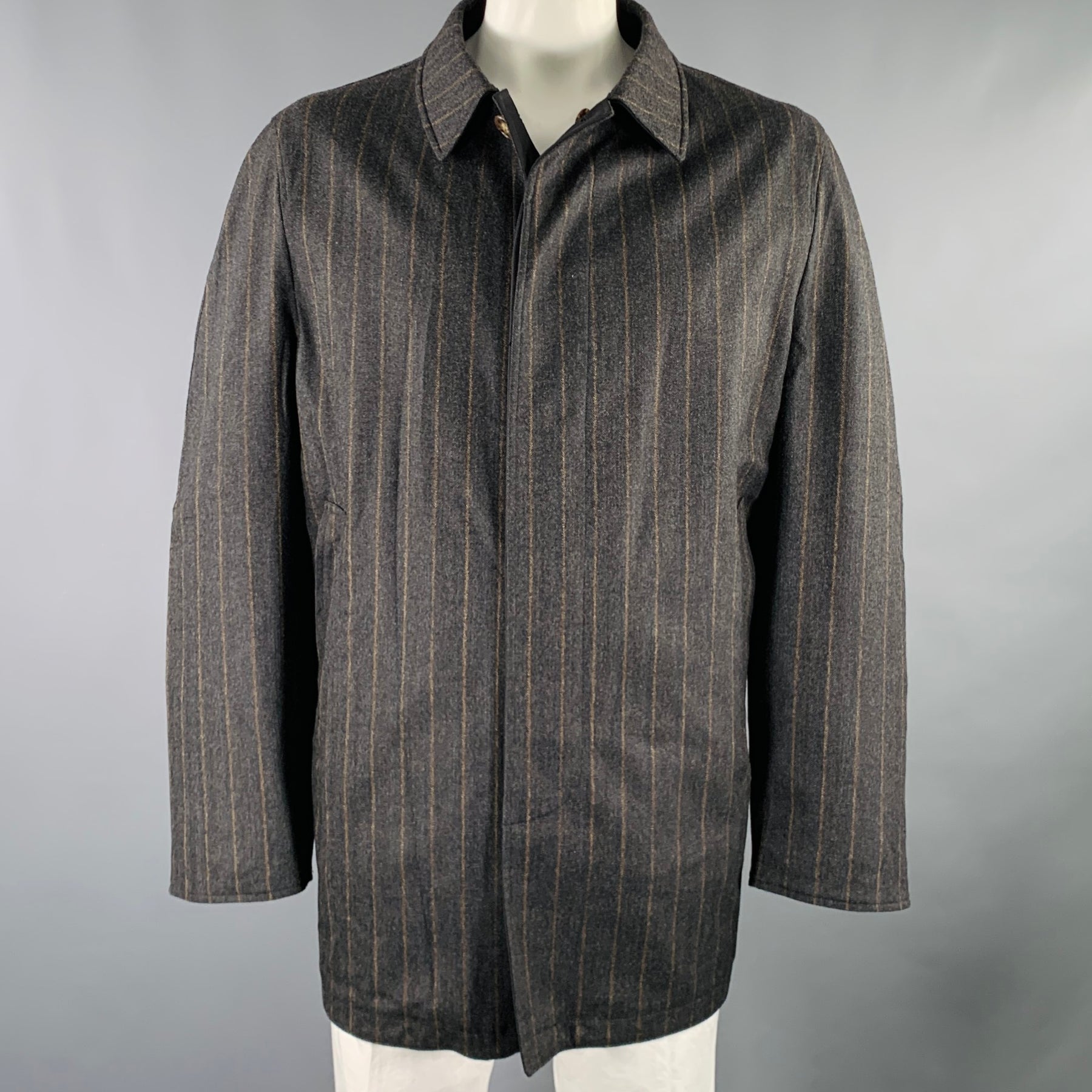 JOHN W. NORDSTROM coat in a grey & brown wool, and black nylon featuring a reversible style, stripe pattern on wool side, and hidden button closure.