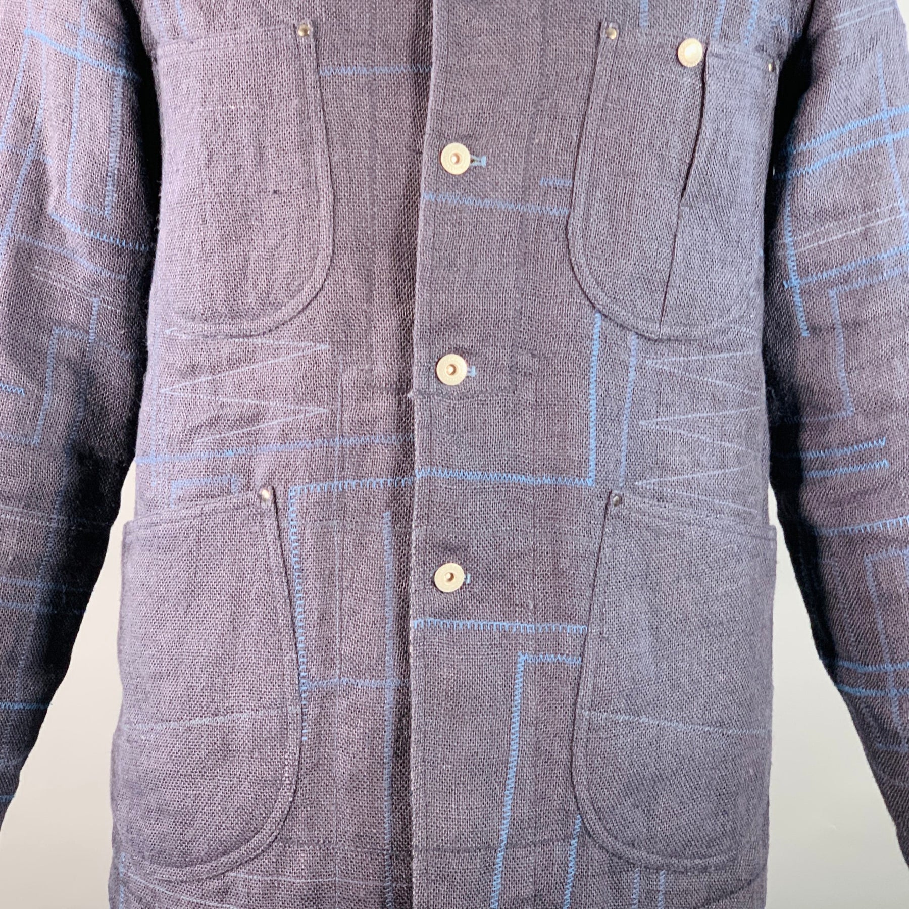 JUNYA WATANABE worker jacket in a navy jute woven fabric featuring an all over blue embroidered design with multiple patch pockets, contrasting blue green spread collar with matching elbow patches, and button closure. Made in Poland.