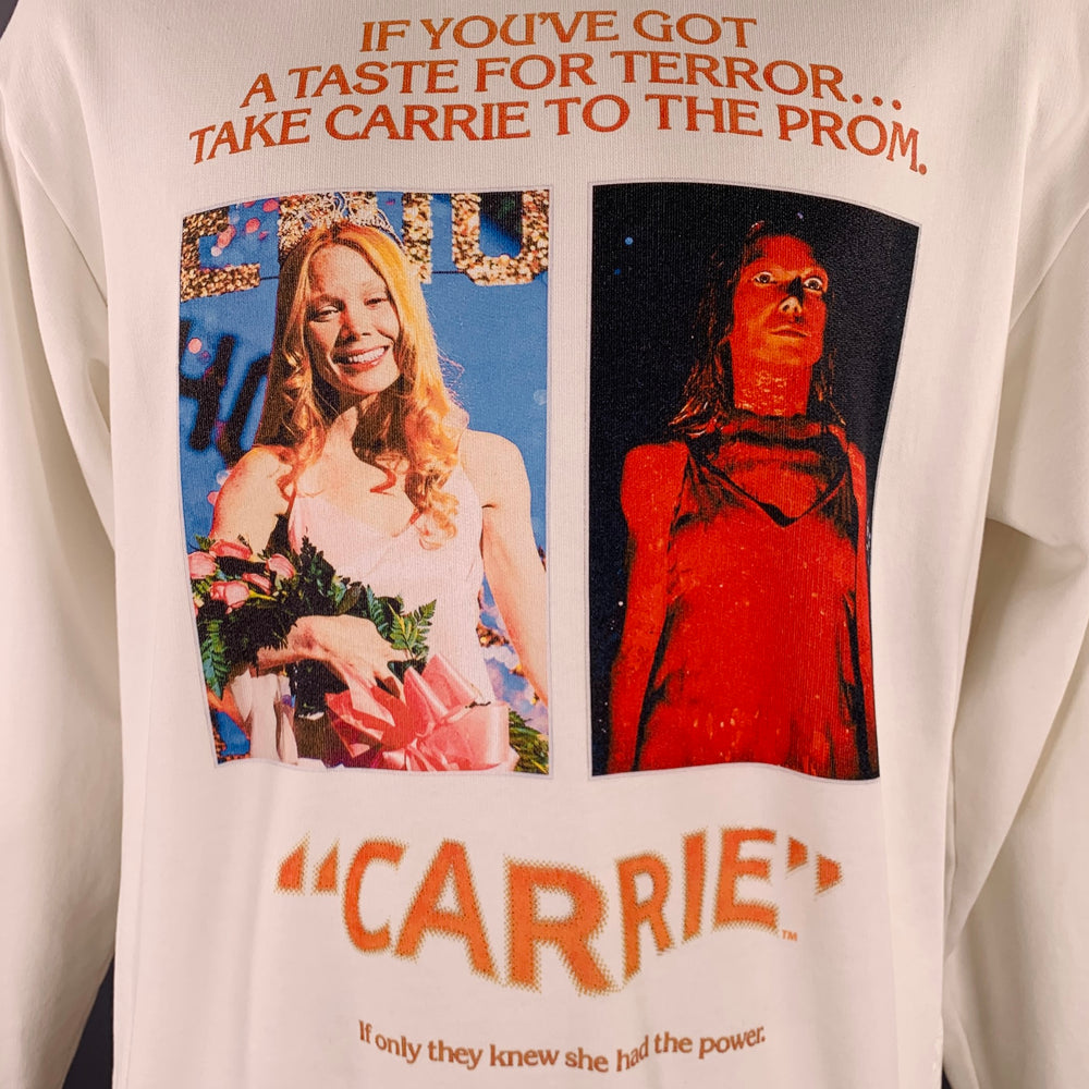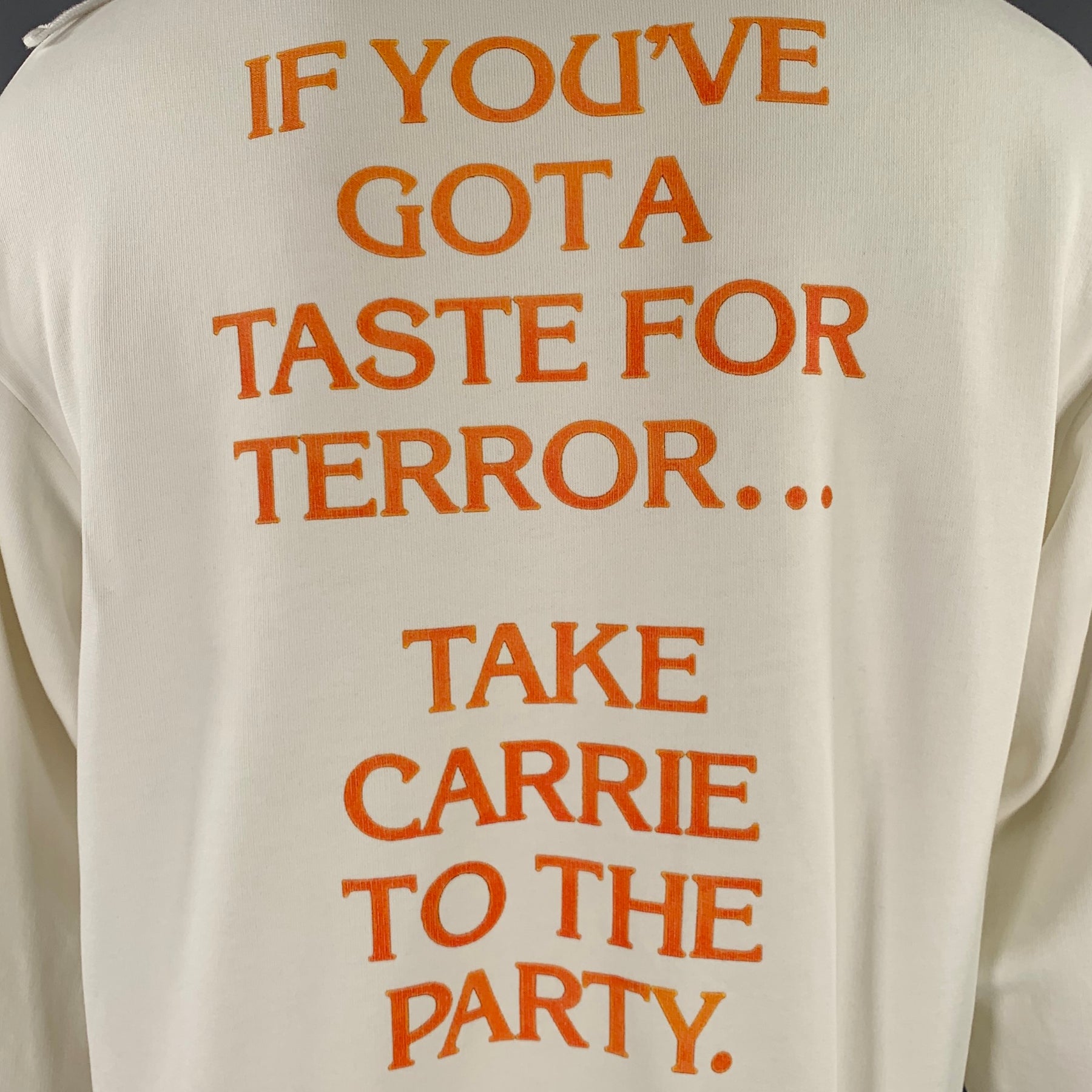 JW ANDERSON x CARRIE sweatshirt in a white cotton featuring a hooded style, and  multi-color CARRIE film poster print on front with graphic text on back. Made in Portugal.