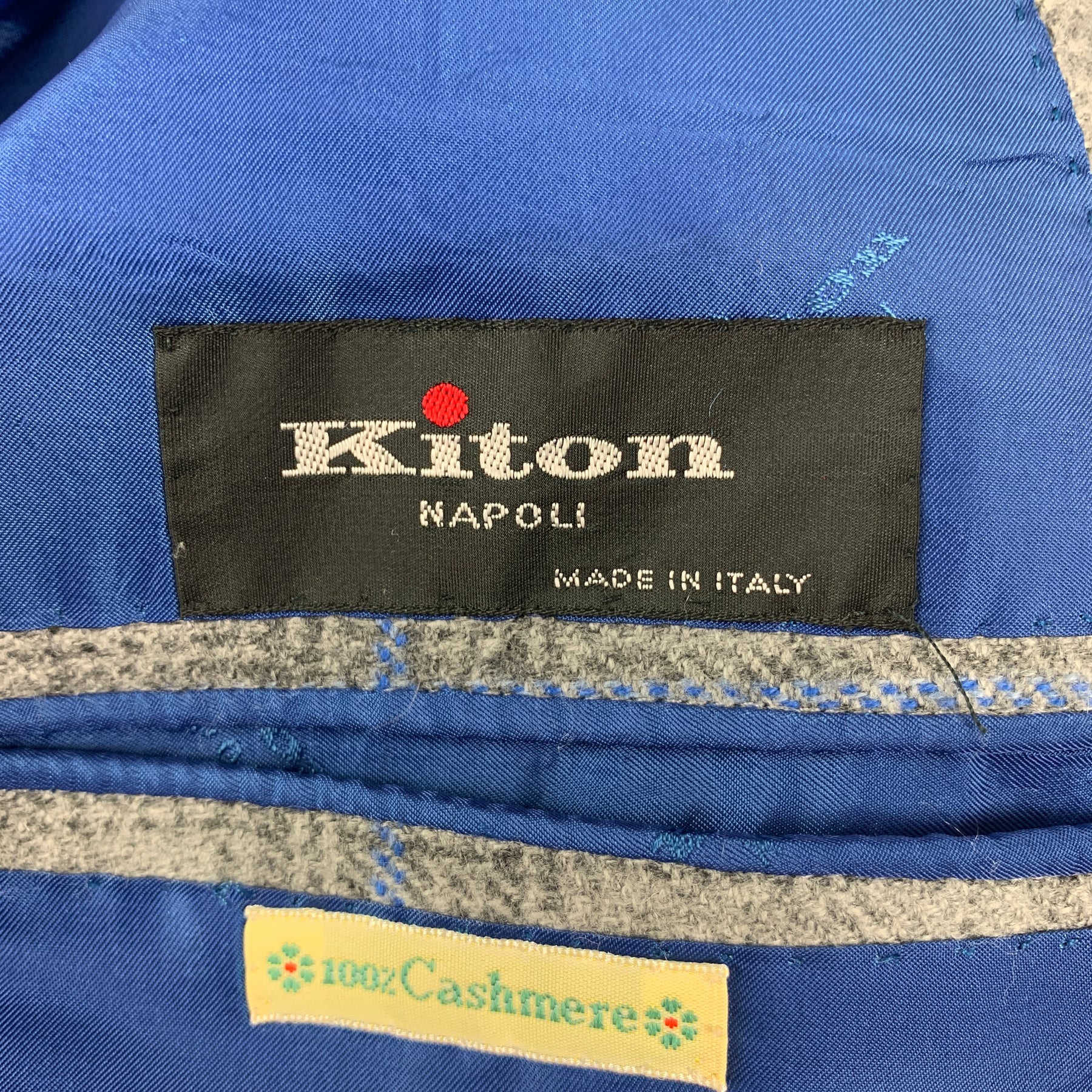 KITON sport coat comes in a grey & blue plaid cashmere with a half liner featuring a notch lapel, patch pockets, double back vent, and a three button closure. Made in Italy.
