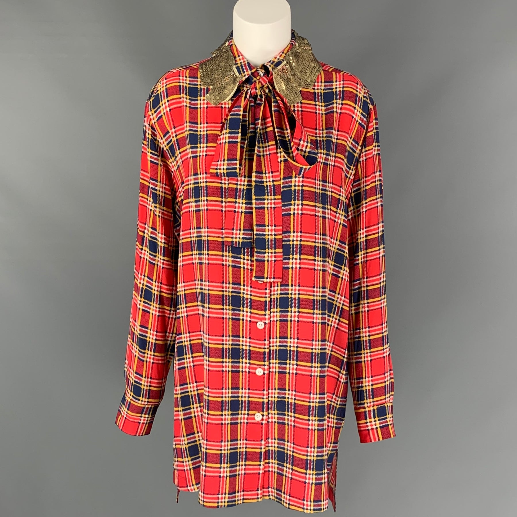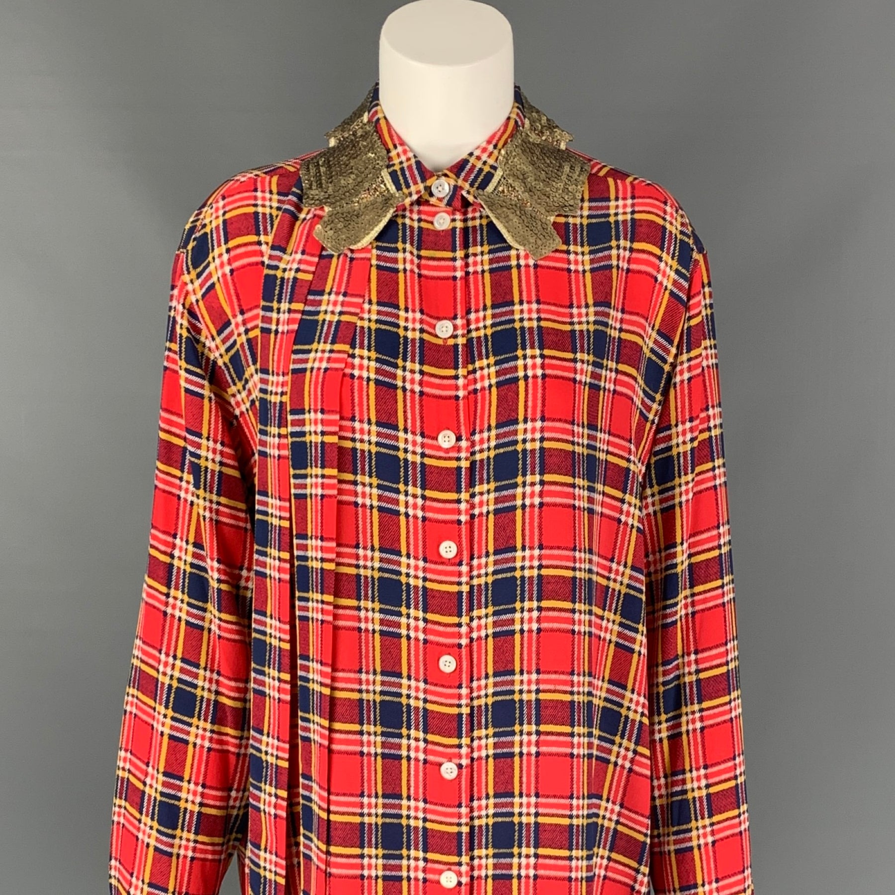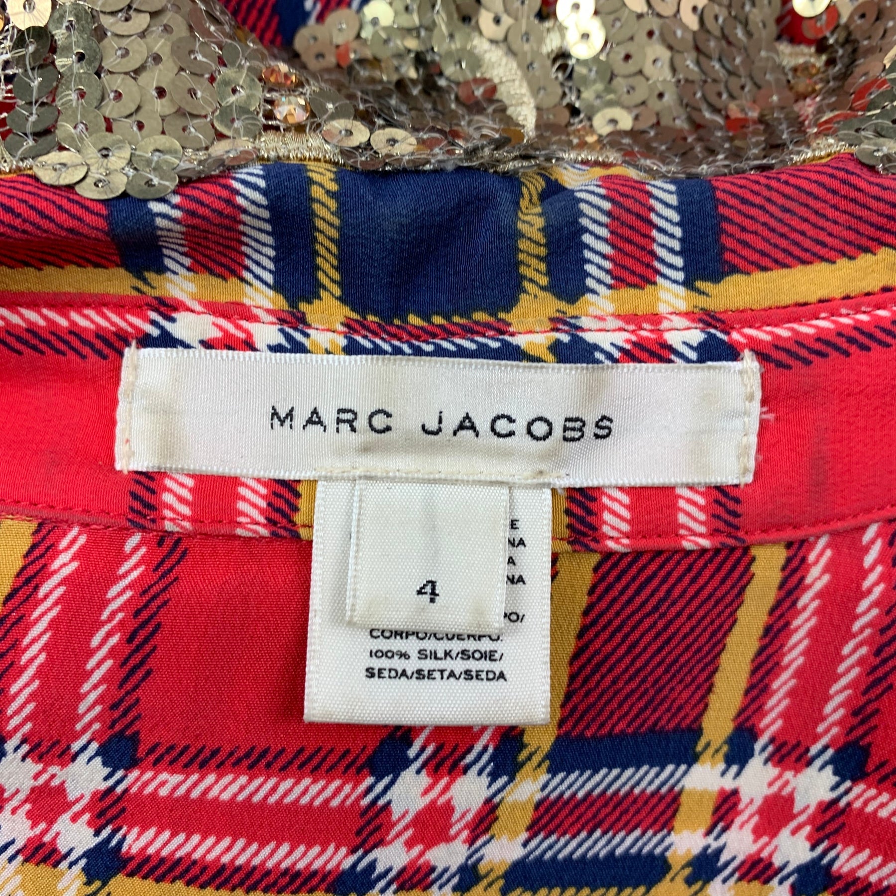 MARC JACOBS Size 4 Red & Blue Silk Plaid Sequin Collar Long Shirt