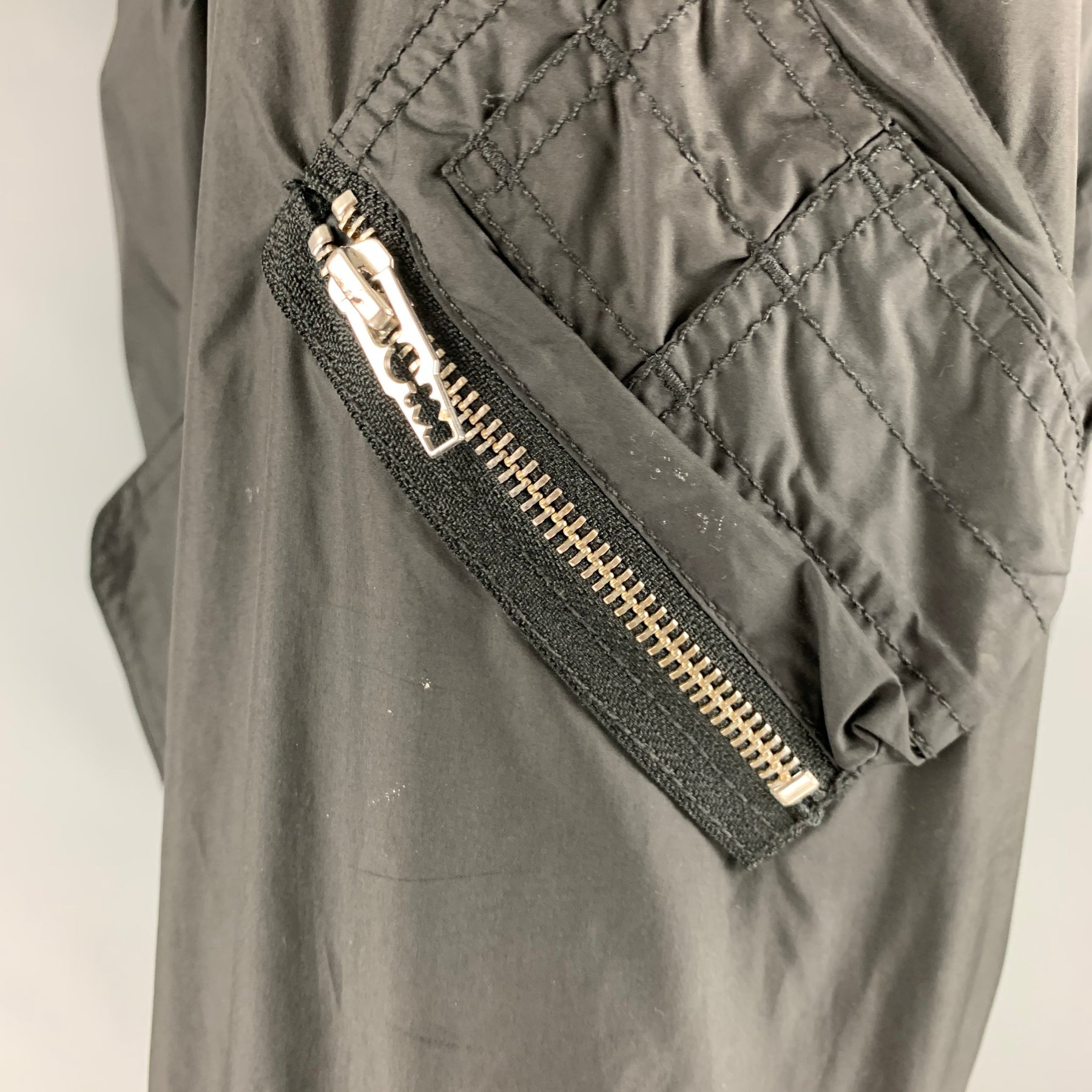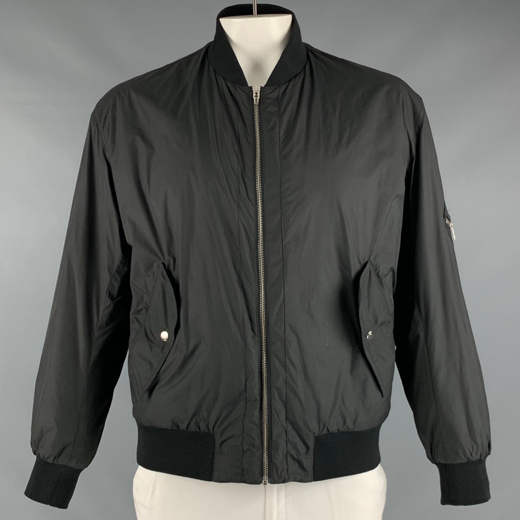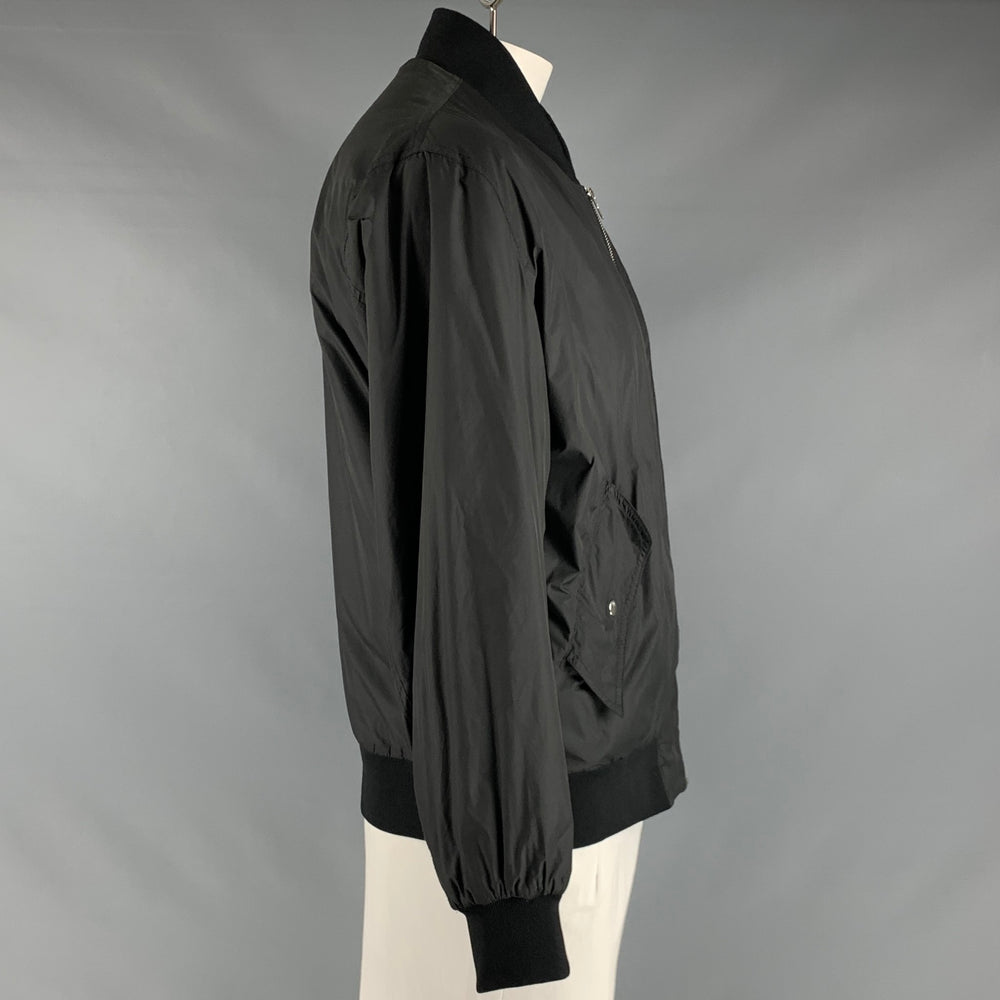 MCQ by ALEXANDER MCQUEEN jacket in a black polyester with orange lining featuring a bomber style, silver tone hardware, and zip up closure.