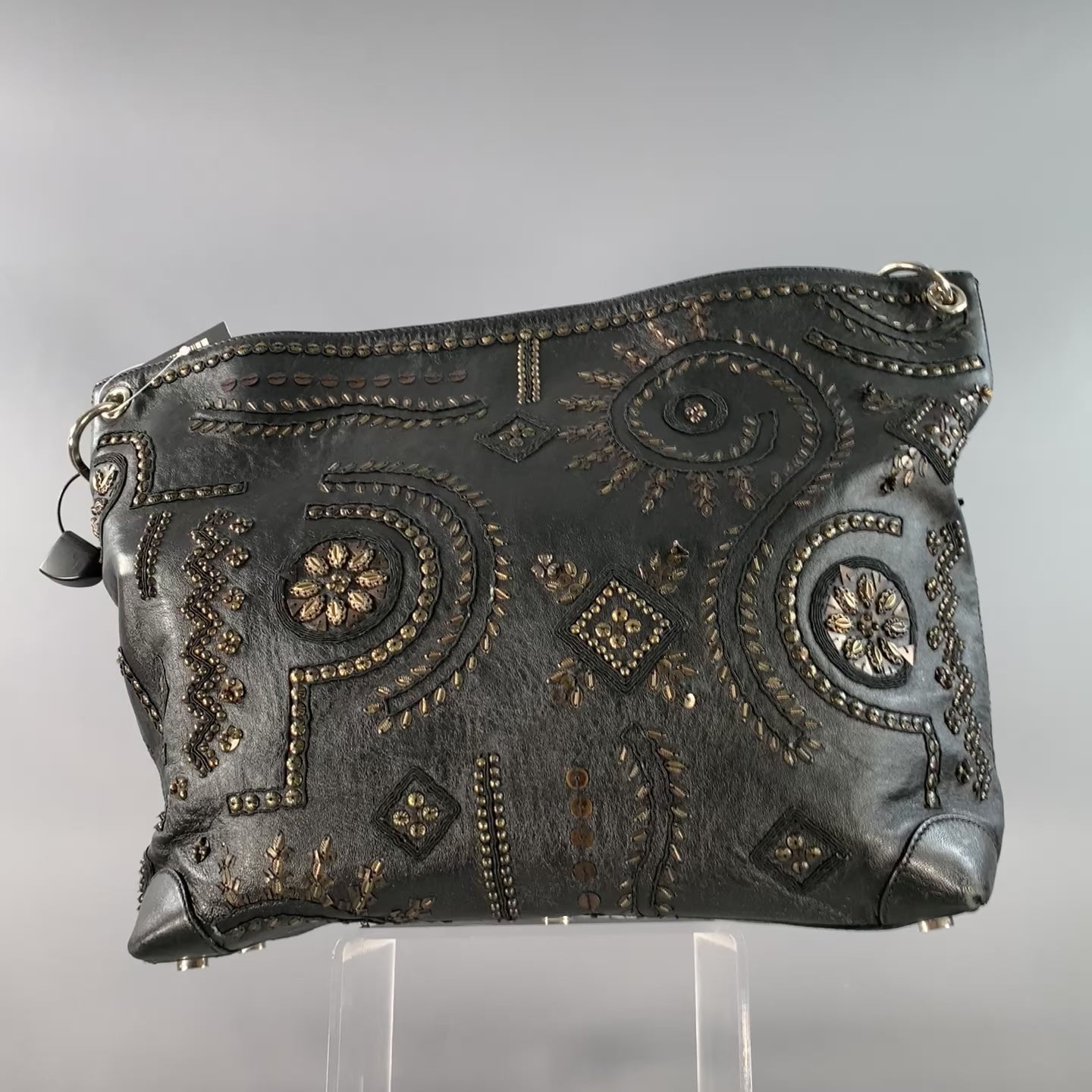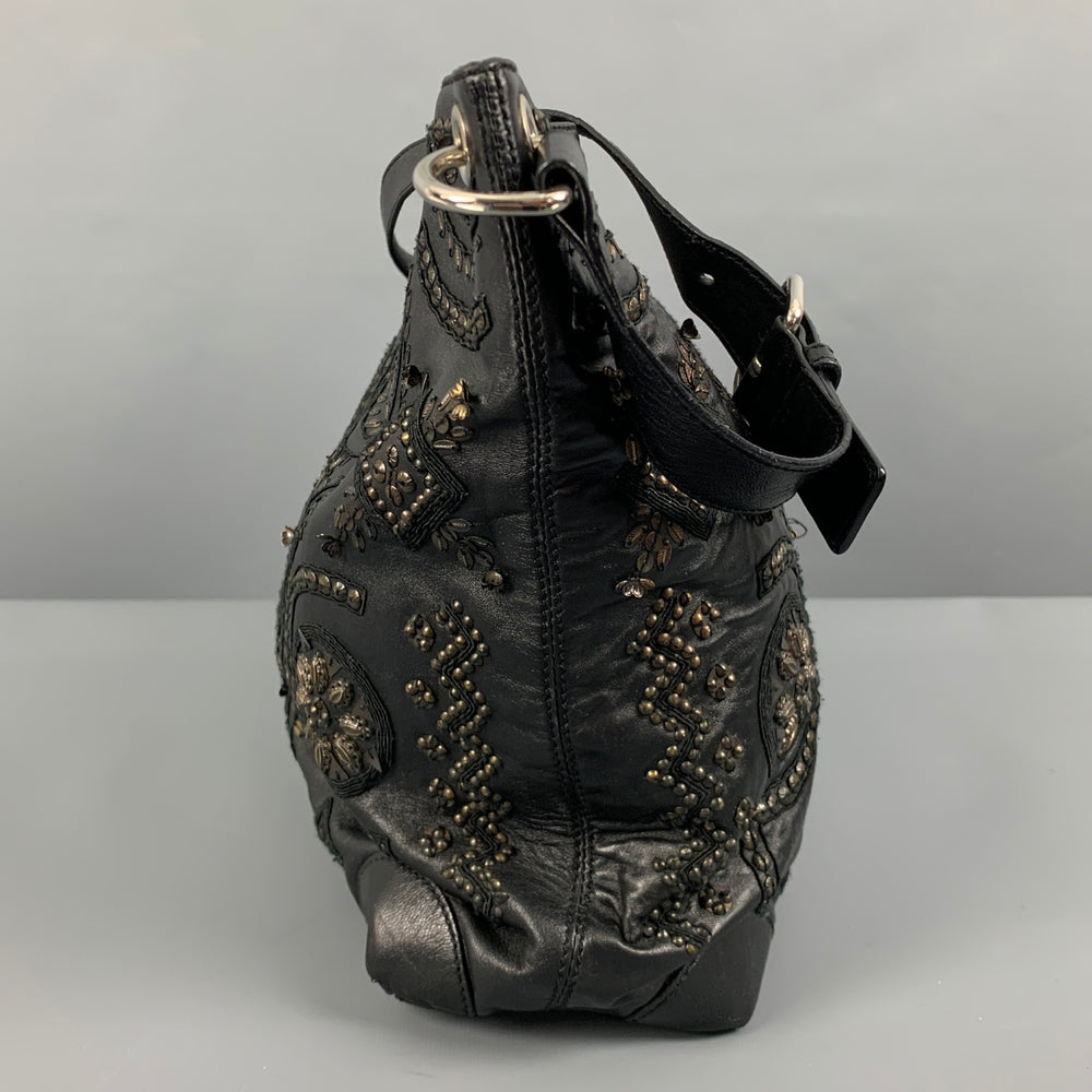 OSCAR DE A RENTA handbag in a black leather fabric featuring gold tone studs and beads, floral design, adjustable shoulder strap, and spacious interior.