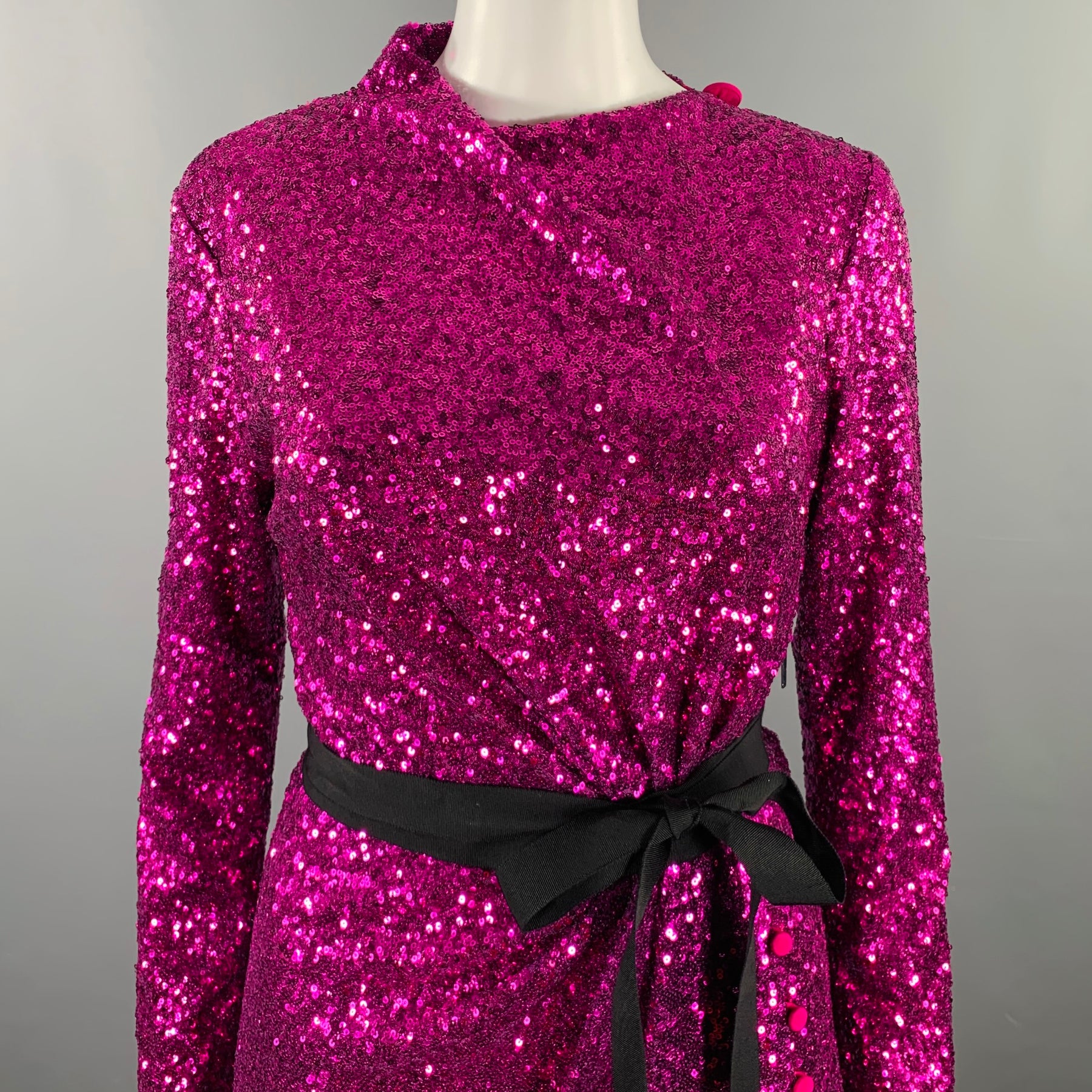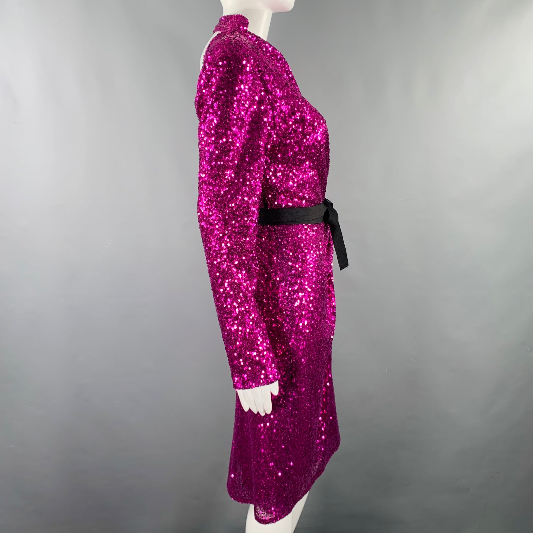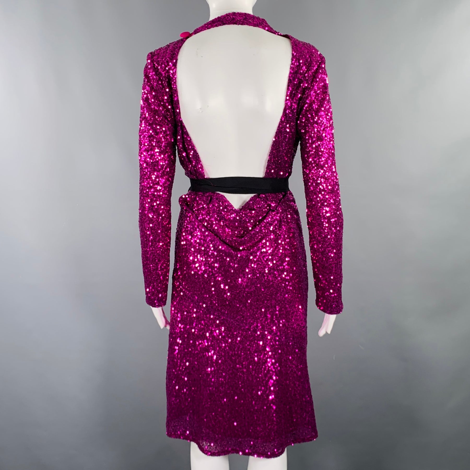 PRABAL GURUNG dress in a purple polyester fabric featuring an all over sequined design, open back, and side zipper closure. Made in USA.