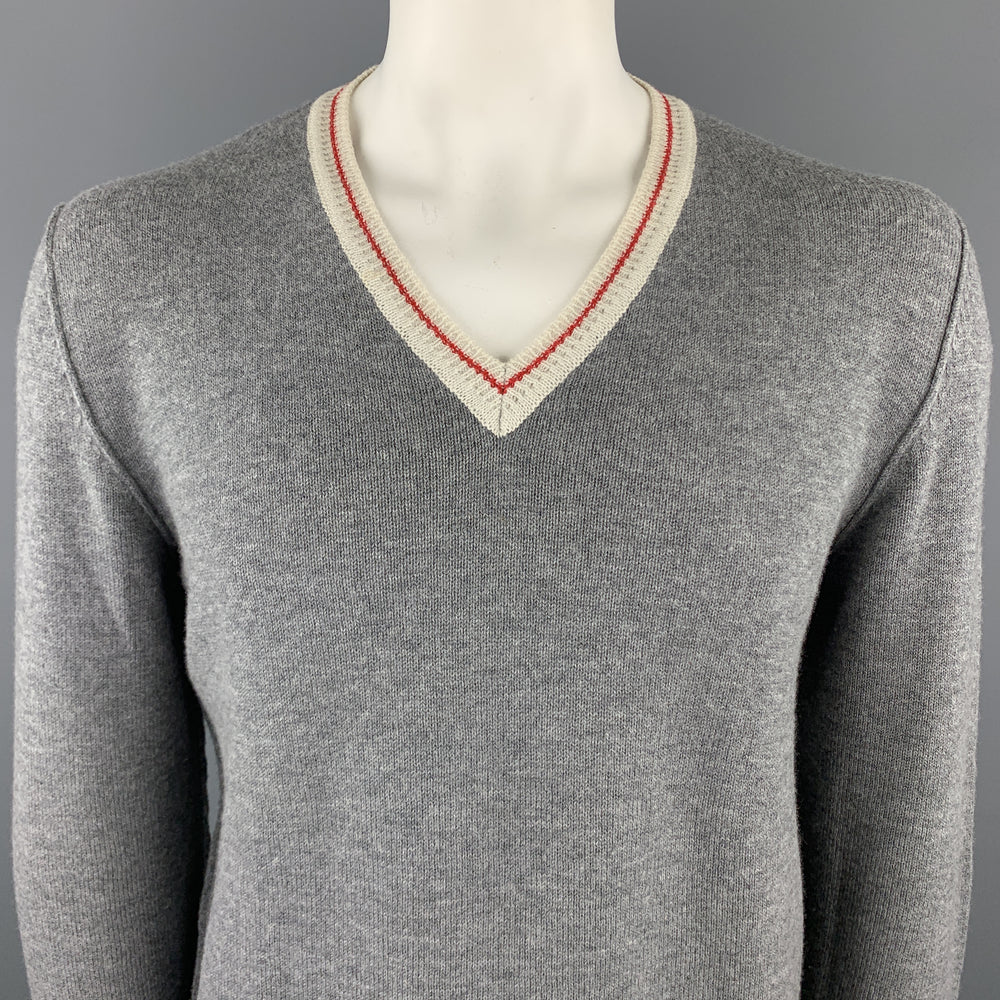 PRADA pullover sweater comes in a gray knitted wool material, with a V-neck, a beige and red trim, suede elbow patches, and ribbed cuffs and hem. Made in Italy.