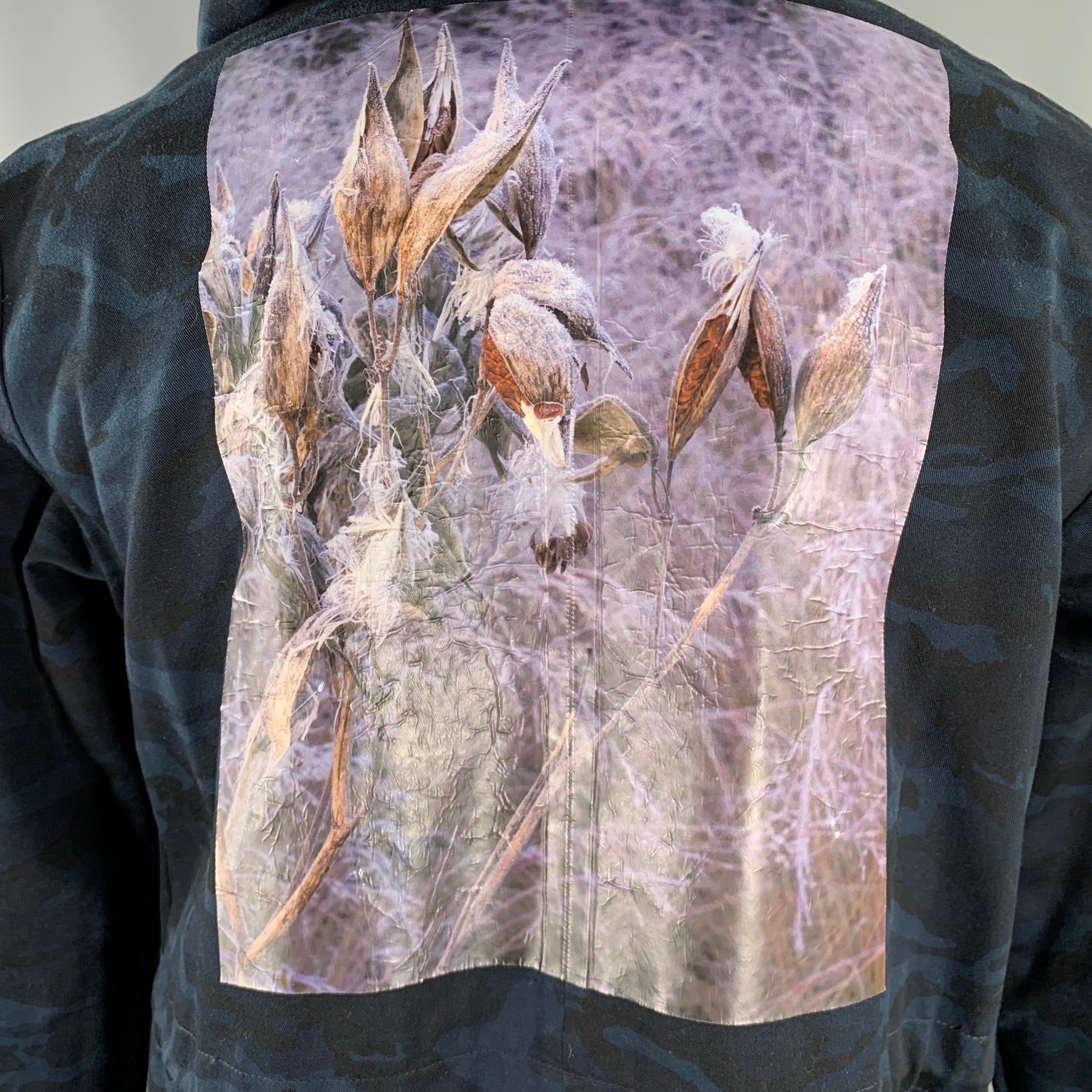 RAF SIMONS x STERLING RUBY coat in a navy and black cotton woven fabric featuring a camouflage pattern, space and nature themed prints, and zip & snaps closure. Made in Italy.