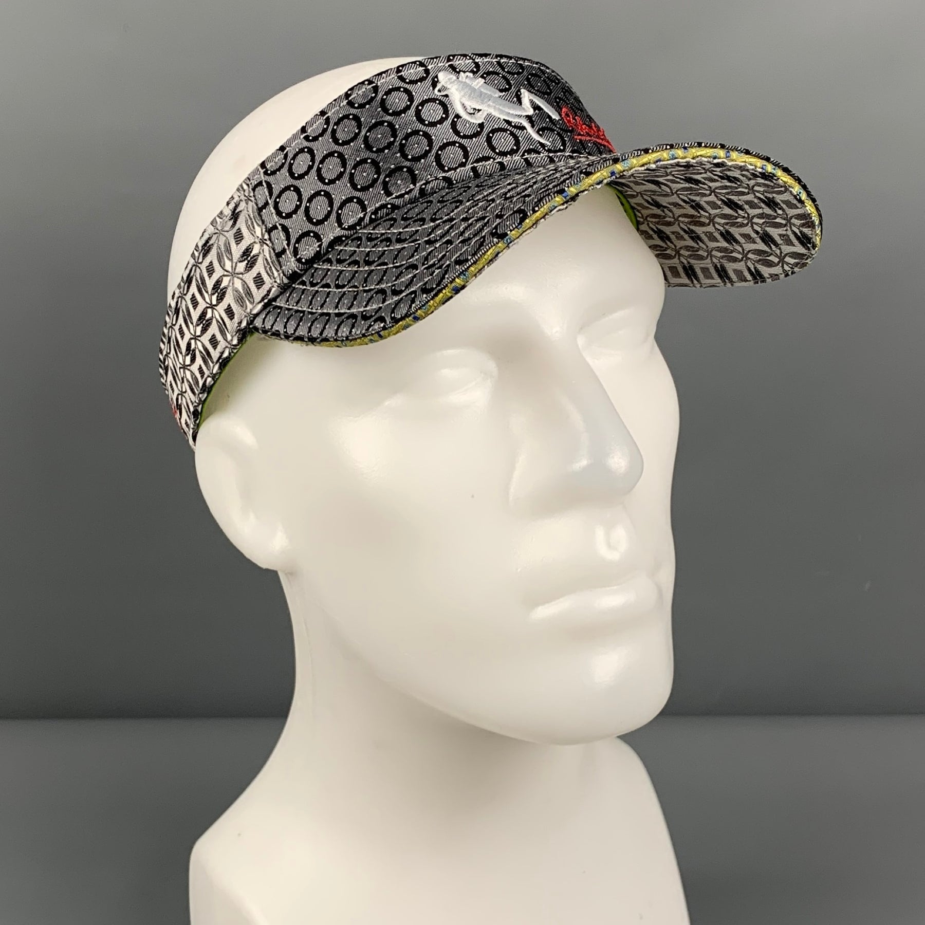 VisorROBERT BANKS hat in a grey silk fabric featuring a visor style, black circle pattern, scuba diver embroidery, and magnetic adjustable closure.